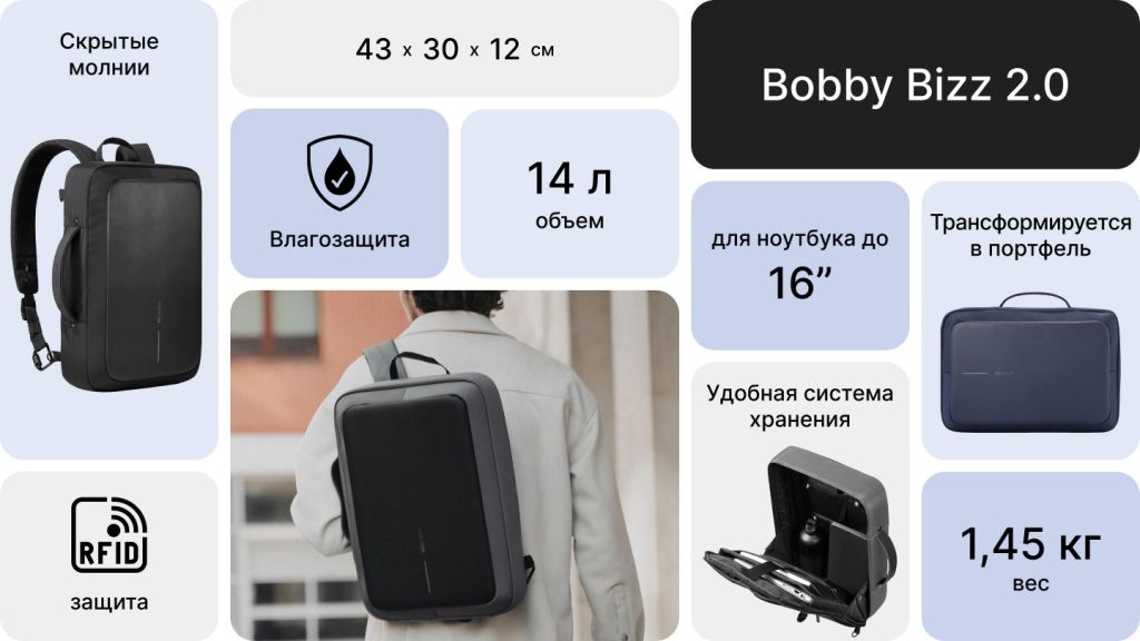 Дизайн Bobby Bizz 2.0 вдохновлен деловой атмосферой мегаполисов и активным стилем жизни. Новая версия представлена в трех цветах — привычном черном, а также сером и синем.